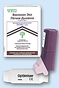 Фармакологическое действие | Фармакокинетика | Показания | Режим дозирования | Побочное действие | Противопоказания | Беременность и лактация | Особые указания | Передозировка | Лекарственное взаимодействие | Условия отпуска из аптек | Условия хранения и сроки годности Фармакологическое действие Беклометазона дипропионат является пролекарством и обладает слабой тропностью к ГКС-рецепторам. Под действием эстераз он превращается в активный метаболит - беклометазона-17-монопропионат (Б-17-МП), который оказывает выраженный местный противовоспалительный эффект. Уменьшает воспаление за счет снижения образования субстанции хемотаксиса (влияние на "поздние" реакции аллергии), тормозит развитие аллергической реакции немедленного типа (обусловлено торможением продукции метаболитов арахидоновой кислоты и снижением высвобождения из тучных клеток медиаторов воспаления) и улучшает мукоцилиарный транспорт. Под действием беклометазона снижается количество тучных клеток в слизистой оболочке бронхов, уменьшается отек эпителия, секреция слизи бронхиальными железами, гиперреактивность бронхов, краевое скопление нейтрофилов, воспалительный экссудат и продукция лимфокинов, тормозится миграция макрофагов, снижается интенсивность процессов инфильтрации и грануляции. Увеличивает количество активных β-адренорецепторов, восстанавливает реакцию больного на бронходилататоры, позволяет уменьшить частоту их применения. Практически не оказывает резорбтивного действия после ингаляционного введения. Не купирует бронхоспазм, терапевтический эффект развивается постепенно, обычно через 5-7 дней курсового применения беклометазона дипропионата. Фармакокинетика Всасывание После ингаляции до 56% дозы препарата оседает в дыхательных путях; оставшееся количество оседает во рту, глотке и проглатывается. В легких перед абсорбцией беклометазона дипропионат интенсивно метаболизируется до активного метаболита Б-17-МП. Системная абсорбция Б-17-МП происходит в легких (36% легочной фракции), в ЖКТ (26% от поступившей сюда при проглатывании дозы). Абсолютная биодоступность неизмененного беклометазона дипропионата и Б-17-МП составляет соответственно около 2% и 62% от ингаляционной дозы. Бекламетазона дипропионат быстро всасывается, Cmax достигается через 0.3 ч. Б-17-МП всасывается медленнее, Cmax достигается через 1 ч. Отмечается приблизительно линейная зависимость между увеличением дозы и системной экспозицией препарата. Распределение Vd составляет 20 л для беклометазона дипропионата и 424 л для Б-17-МП. Связывание с белками плазмы крови относительно высокое - 87%. Выведение Беклометазона дипропионат и Б-17-МП имеют высокий плазменный клиренс (150 л/ч и 120 л/ч соответственно). T1/2 составляет 0.5 ч и 2.7 ч соответственно. Показания — базисная терапия различных форм бронхиальной астмы у взрослых и детей старше 4 лет. Режим дозирования Беклазон Эко Легкое Дыхание предназначен только для ингаляционного введения. Беклазон Эко Легкое Дыхание применяется регулярно (даже при отсутствии симптомов заболевания), дозу беклометазона дипропионата подбирают с учетом клинического эффекта в каждом конкретном случае. При легком течении бронхиальной астмы объем форсированного выдоха (ОФВ) или пиковая скорость выдоха (ПСВ) составляют более 80% от должных величин с разбросом показателей 
