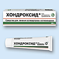 Фармакологическое действие | Фармакокинетика | Показания | Режим дозирования | Побочное действие | Противопоказания | Беременность и лактация | Особые указания | Передозировка | Лекарственное взаимодействие | Условия отпуска из аптек | Условия хранения и сроки годности Фармакологическое действие Стимулятор регенерации тканей. Хондроксид нормализует обмен веществ в гиалиновой ткани, стимулирует регенерационные (восстановительные) процессы в суставном хряще, оказывает анальгезирующее и противовоспалительное действие, замедляет прогрессирование остеоартроза и остеохондроза. Препарат содержит натуральный компонент хондроитин сульфат, получаемый из хрящевой ткани крупного рогатого скота. Является высокомолекулярным мукополисахаридом, который замедляет резорбцию костной ткани и снижает потери кальция, улучшает фосфорно-кальциевый обмен в хрящевой ткани, ускоряет процессы ее репарации, тормозит процесс дегенерации хрящевой ткани. Препятствует коллапсу соединительной ткани. Ингибирует ферменты, вызывающие поражение хрящевой ткани, стимулирует синтез глюкозамингликанов, способствует регенерации суставной сумки и хрящевых поверхностей суставов, увеличивает продукцию внутрисуставной жидкости. Это приводит к уменьшению болезненности и увеличению подвижности пораженных суставов. Диметилсульфоксид способствует лучшему проникновению хондроитин сульфата через клеточные мембраны вглубь тканей. Оказывает некоторое противовоспалительное, анальгезирующее и фибринолитическое действие. Фармакокинетика Данные о фармакокинетике препарата Хондроксид не предоставлены. Показания — лечение и профилактика дегенеративно-дистрофических заболеваний суставов и позвоночника (остеоартроз, остеохондроз). Режим дозирования Мазь наносят 2-3 раза/сут на кожу над очагом поражения, втирая до полного впитывания в течение 2-3 мин. Курс лечения – 2-3 недели. При необходимости курс лечения повторяют. Побочное действие Возможно: аллергические реакции. Противопоказания — повышенная чувствительность к компонентам препарата. Применение при беременности и кормлении грудью С осторожностью следует применять Хондроксид при беременности и в период лактации (грудного вскармливания). Особые указания Не следует допускать попадания препарата на слизистые оболочки и открытые раны. Использование в педиатрии С осторожностью следует назначать препарат детям (эффективность и безопасность применения в педиатрии не установлены). Передозировка В настоящее время о случаях передозировки препарата Хондроксид не сообщалось. Лекарственное взаимодействие Лекарственное взаимодействие препарата Хондроксид не описано. Условия отпуска из аптек Препарат разрешен к применению в качестве средства безрецептурного отпуска. Условия и сроки хранения Мазь следует хранить в защищенном от света, недоступном для детей месте при температуре от 2° до 20°С. Срок годности – 3 года. | ||||||||